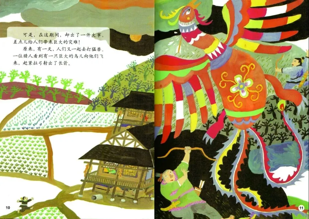 原来,有一天,人们又一起去打猛兽。一位猎人看到有一只巨大的鸟儿向他们飞来,赶紧拉弓射出了长箭。