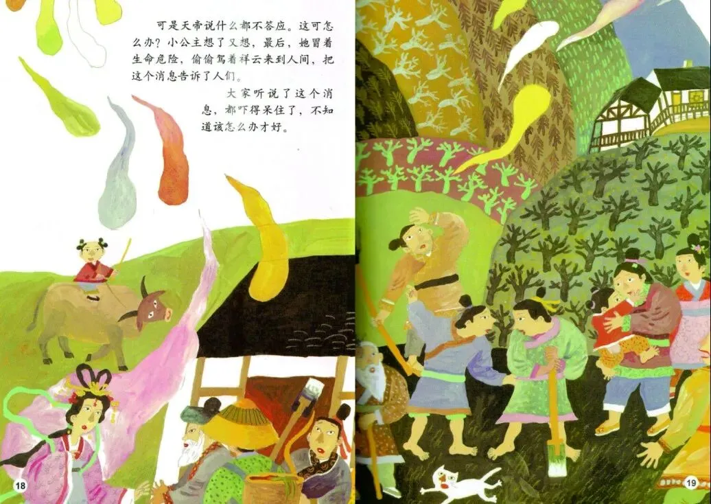 可是天帝说什么都不答应。这可怎么办?小公主想了又想,最后,她冒着生命危险,偷偷驾着祥云来到人间,把这个消息告诉了人们。