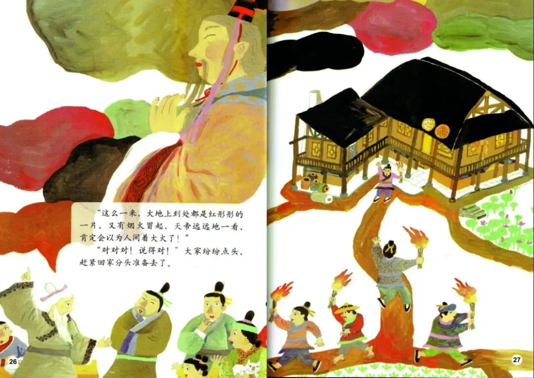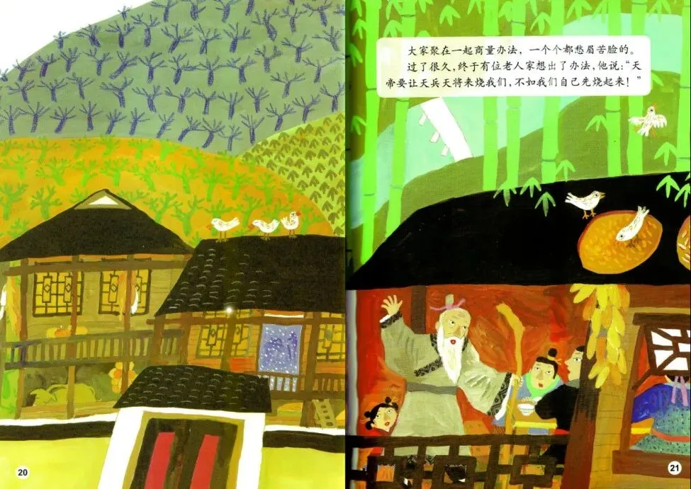 过了很久,终于有位老人家想出了办法,他说:“天帝要让天兵天将来烧我们,不如我们自己先烧起来!”
