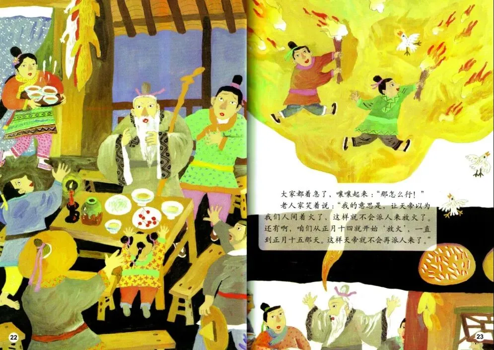 老人家笑着说:“我的意思是,让天帝以为我们人间着火了,这样就不会派人来放火了。还有啊,咱们从正月十四就开始‘放火',一直到正月十五那天。这样天帝就不会再派人来了。”