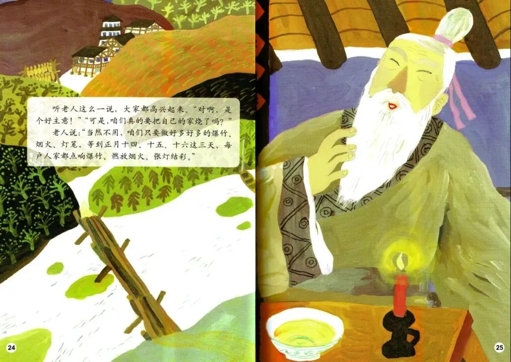 老人说:“当然不用,咱们只要做好多好多的爆竹、烟火、灯笼,等到正月十四、十五、十六这三天,每户人家都点响爆竹、燃放烟火、张灯结彩。"