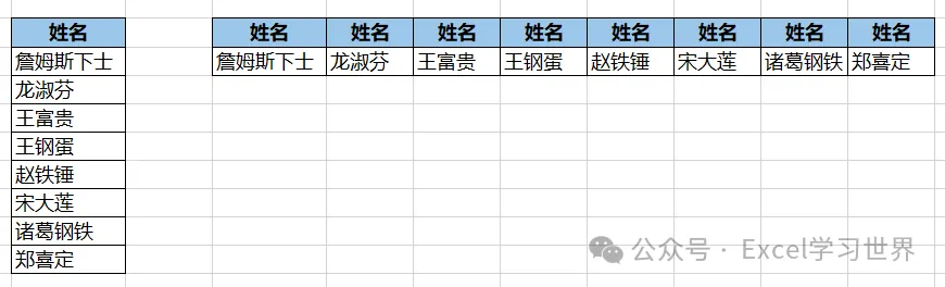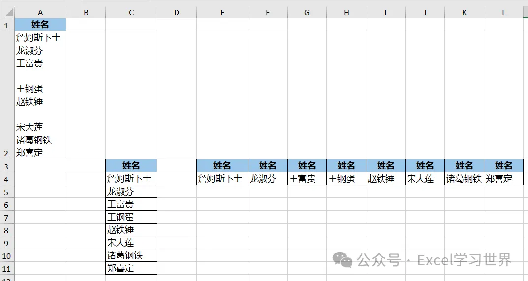 将下图 1 中合并单元格内的姓名按行拆分出来,拆分后的结果分别按列和按行排列,效果如下图 2 所示。