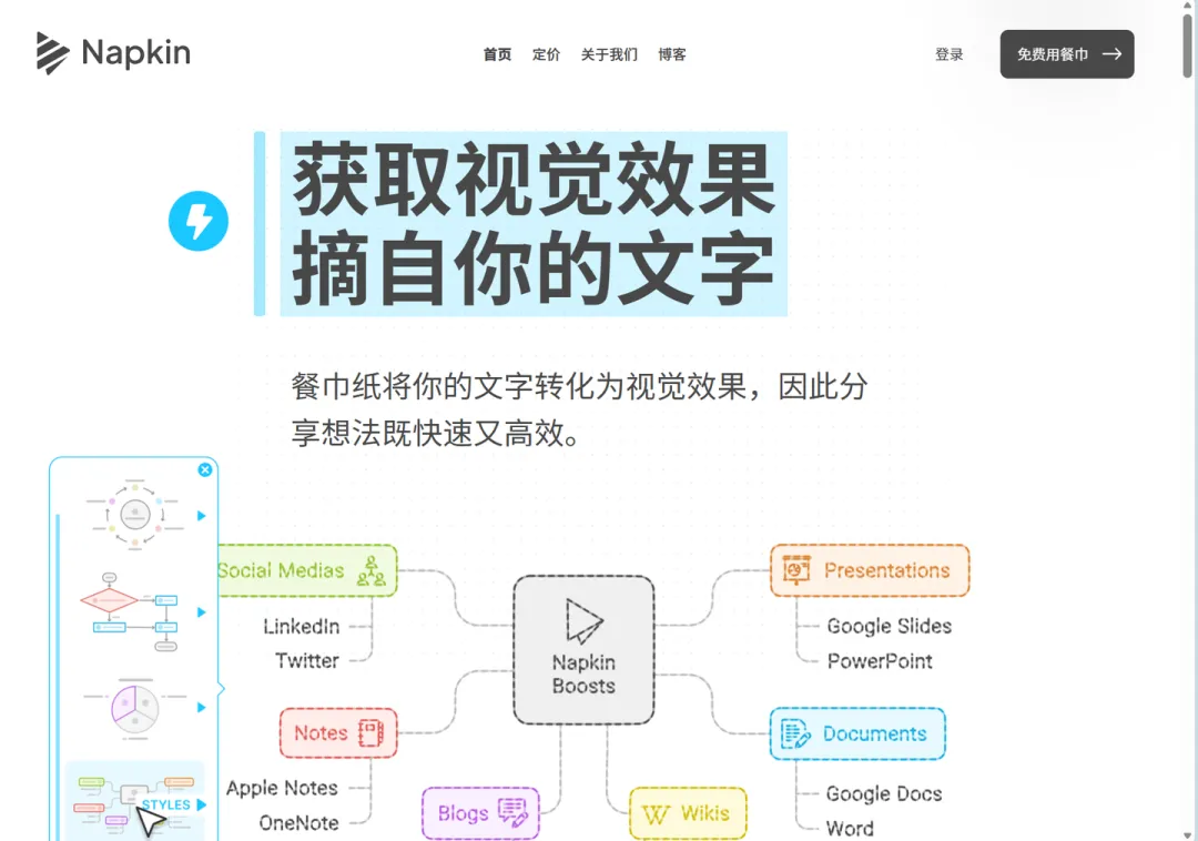 Napkin 是一款颇具创意的工具,它的理念是“用文字描述,自动生成图表”。虽然它最初定位为产品原型或思维导图工具,但我在实际使用中发现,它在制作概念性 PPT 图表时表现非常出色,尤其适合表达逻辑关系、系统架构或业务流程。