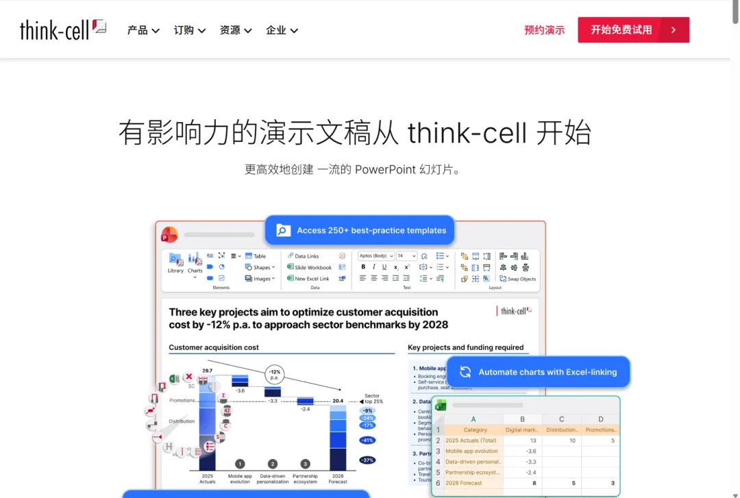 ThinkCell 虽然价格较高,但在专业领域享有极高声誉,尤其受到麦肯锡、BCG 等顶级咨询公司的青睐。它同样是 PowerPoint 插件形式,专注于高精度数据图表的制作,如瀑布图、甘特图、马赛克图等复杂类型。