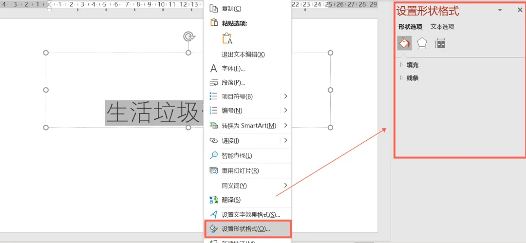 ❶ 首先全选需要设计的文字,鼠标右键点击【设置形状格式】,接下来就在右侧弹出框中设置形状格式参数。