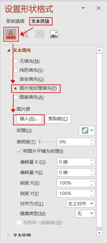 文本填充中选择【图片或纹理填充】-【插入】,选择准备好的图片。
