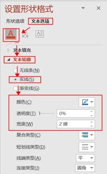 ❸ 点击【文本选项】-【文本填充与轮廓】中设置参数。
