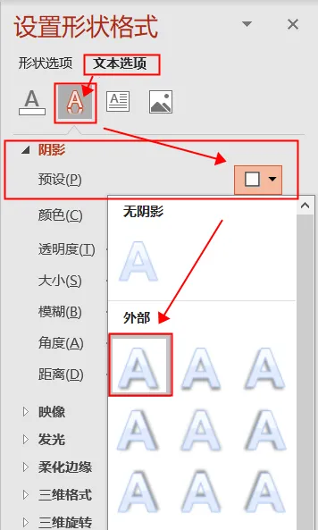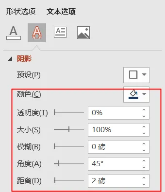 ❹ 在【文本选项】-【文字效果】-【阴影】中设置参数如下: