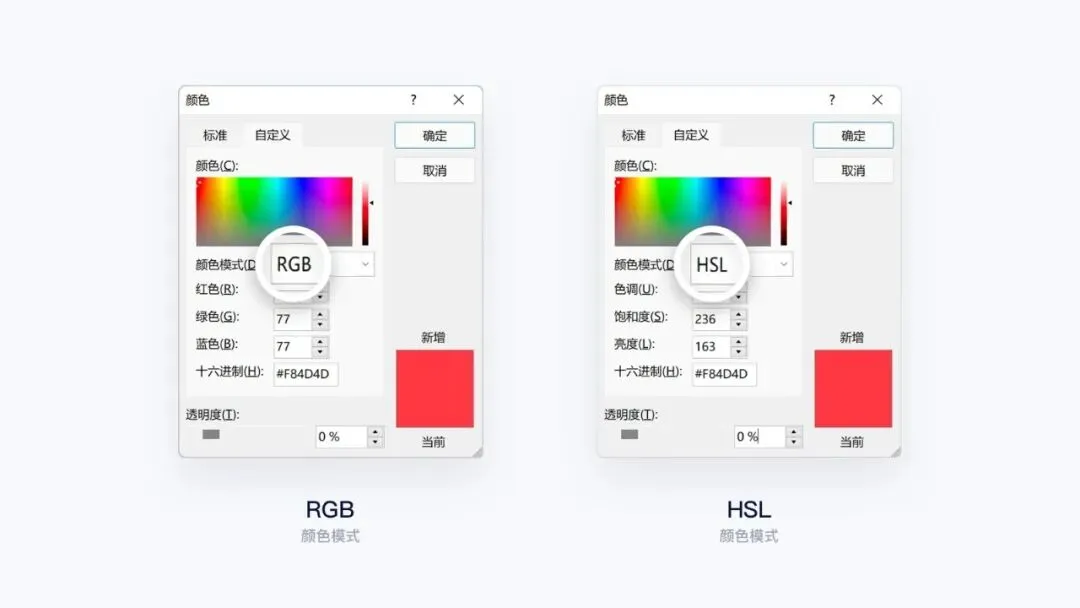 在 Windows 系统中的 PPT 调色器中,有两种颜色模式:RGB、HSL