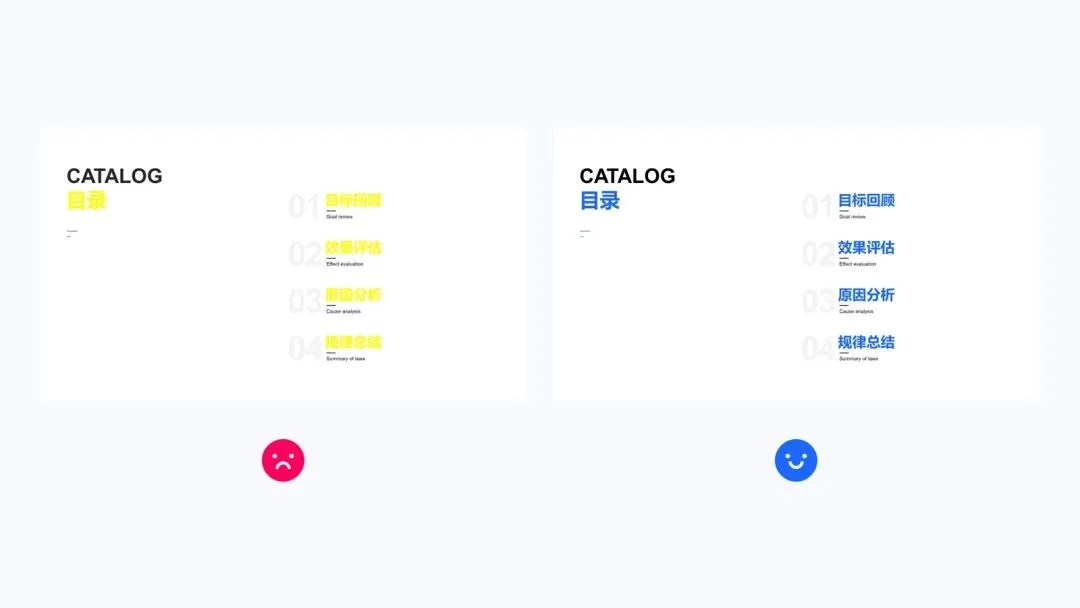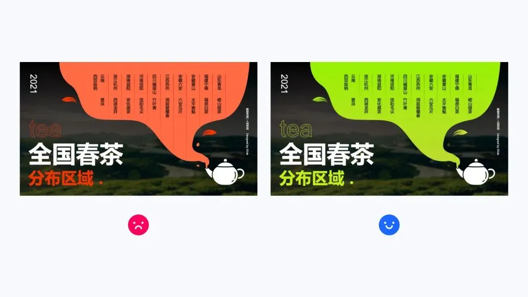 颜色的搭配要遵循内容的可读性,背景和文字同时使用过于鲜艳或者对比度低的颜色,会使得内容可读性变差。