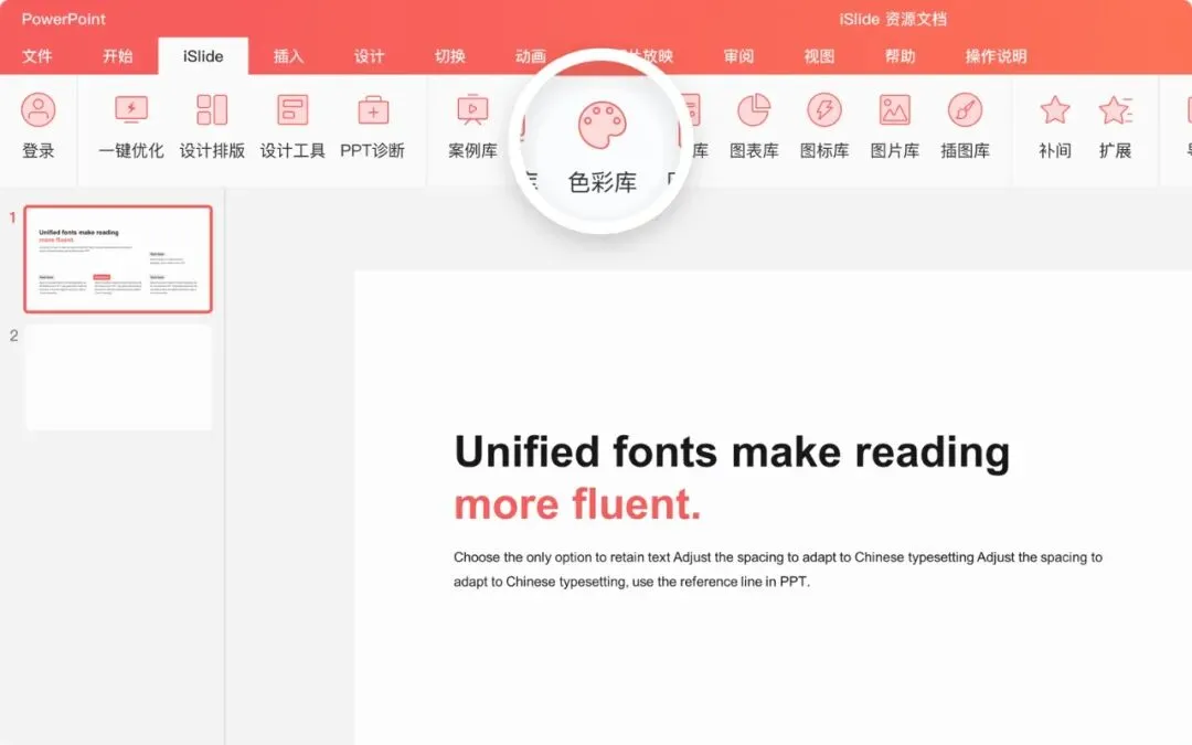 首先让我们在 iSlide 的菜单栏里找到「色彩库」功能,点击进入。