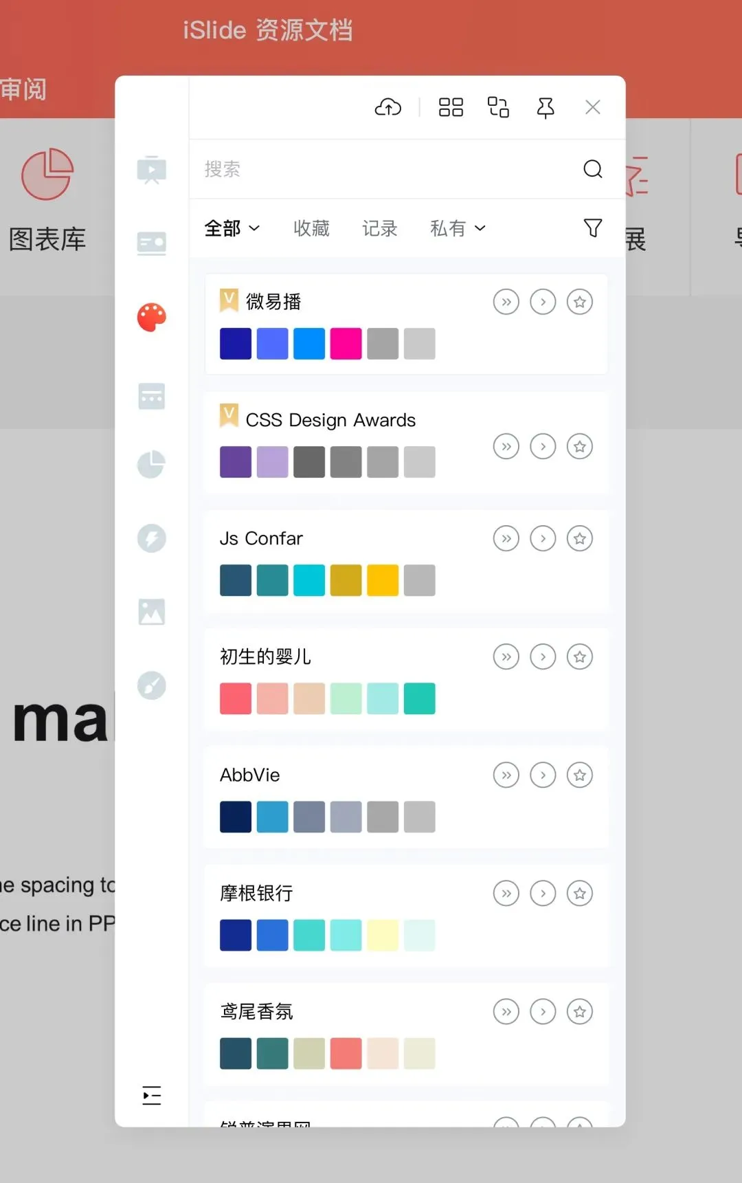 iSlide 的「色彩库」收录了全球知名公司的色彩搭配方案,你可以在「色彩库」中浏览并一键应用于当前的 PPT 文档,即便不懂设计,也能呈现专业。