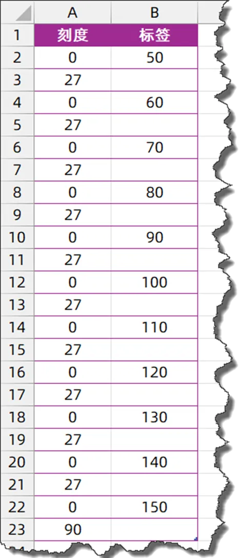 在A2和A3分别输入0和27,复制后粘贴9次,在A22输入0,A23输入90。