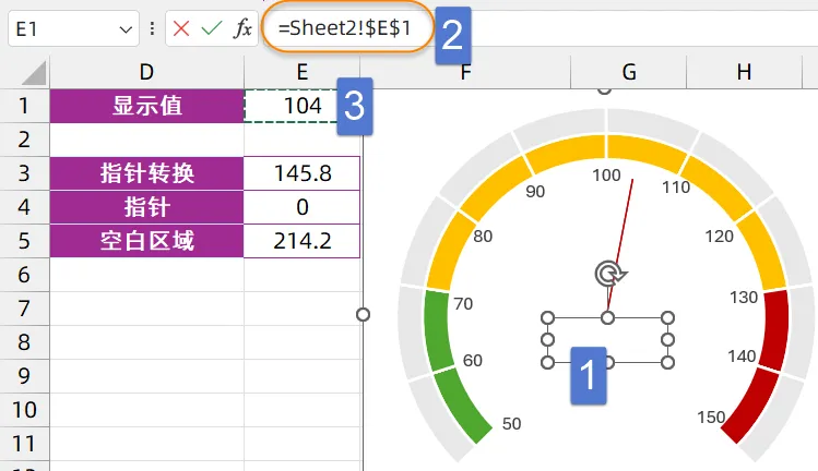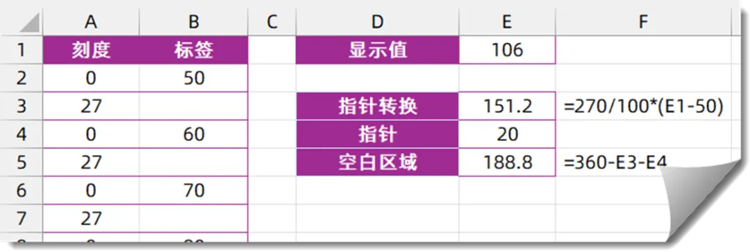 从50°~150°,在总计270°的扇形区域中共有100个值,因此270除以100先算出每个数值的度数,再使用度数乘以(E1-50)。