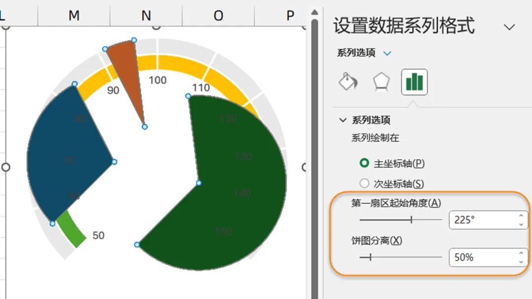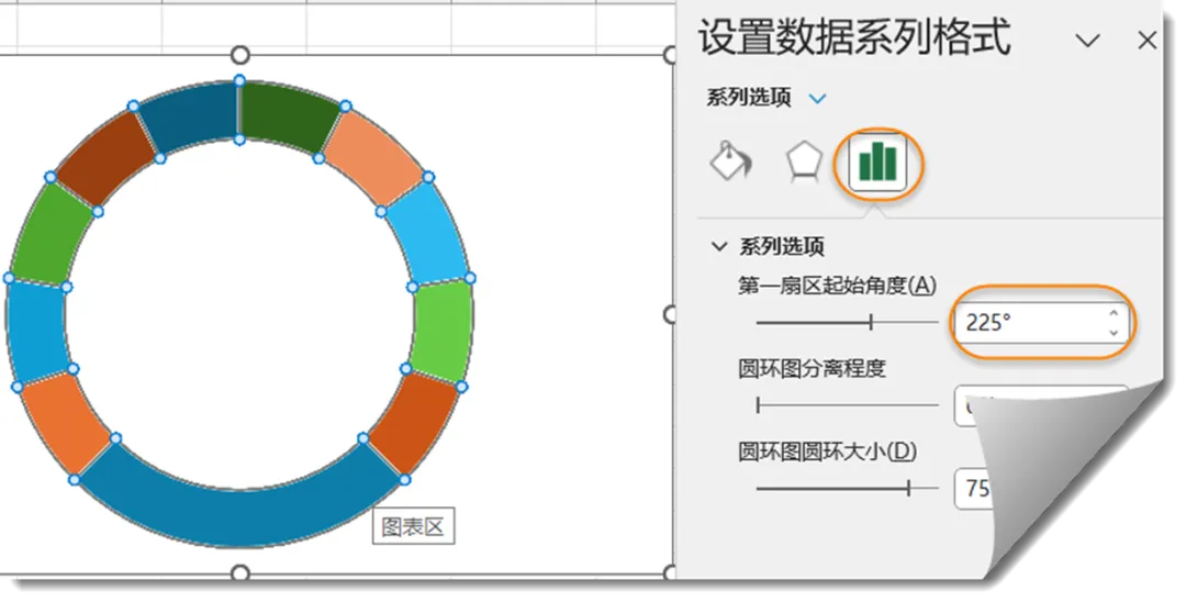 右键单击圆环图,设置数据系列格式,将第一扇区的起始角度设置为225°。