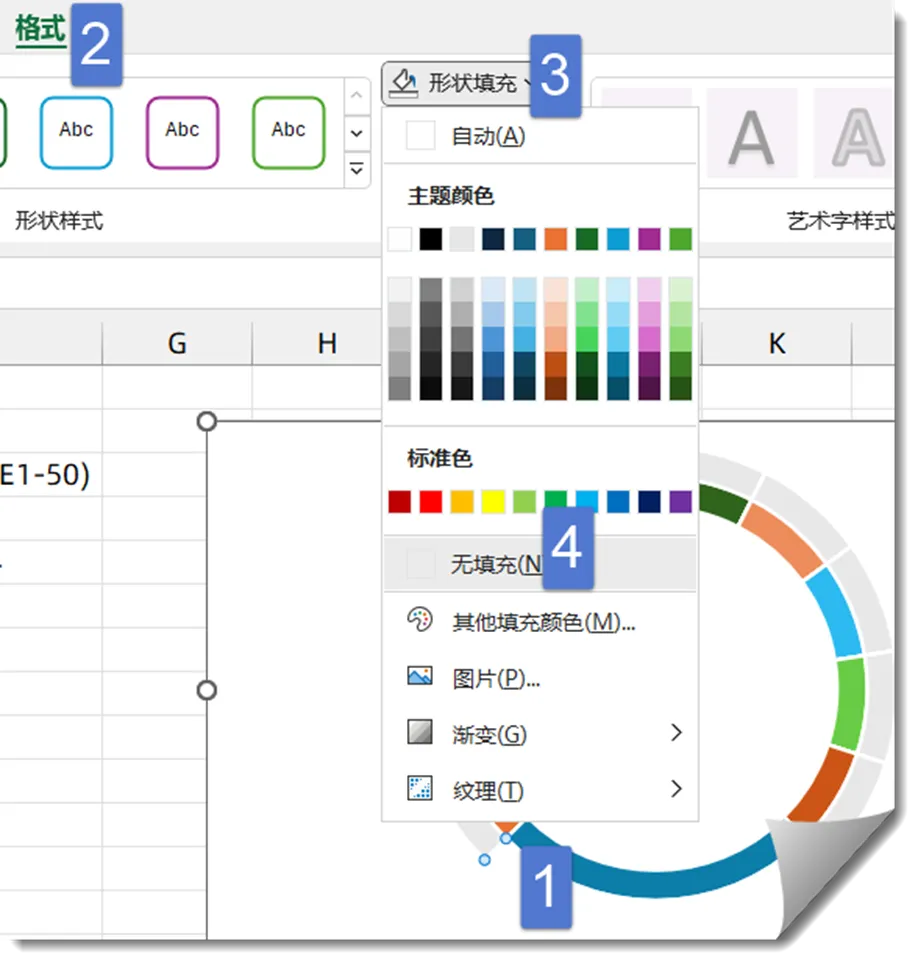 单击选中最外层的圆环系列,【格式】→【形状填充】,设置为浅灰色。
