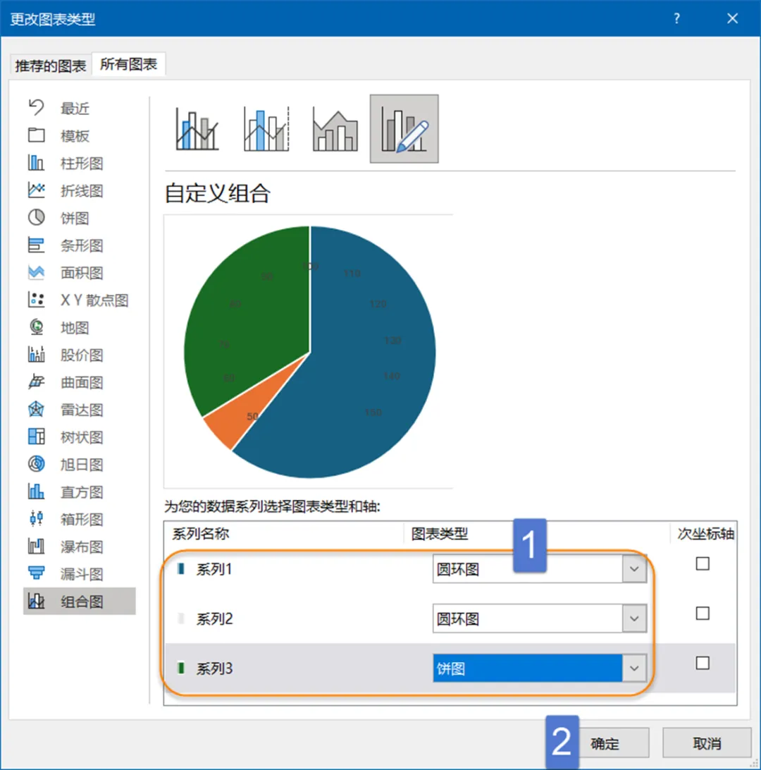 右键单击图表,更改系列图表类型,将系列3设置为饼图。