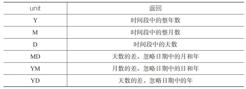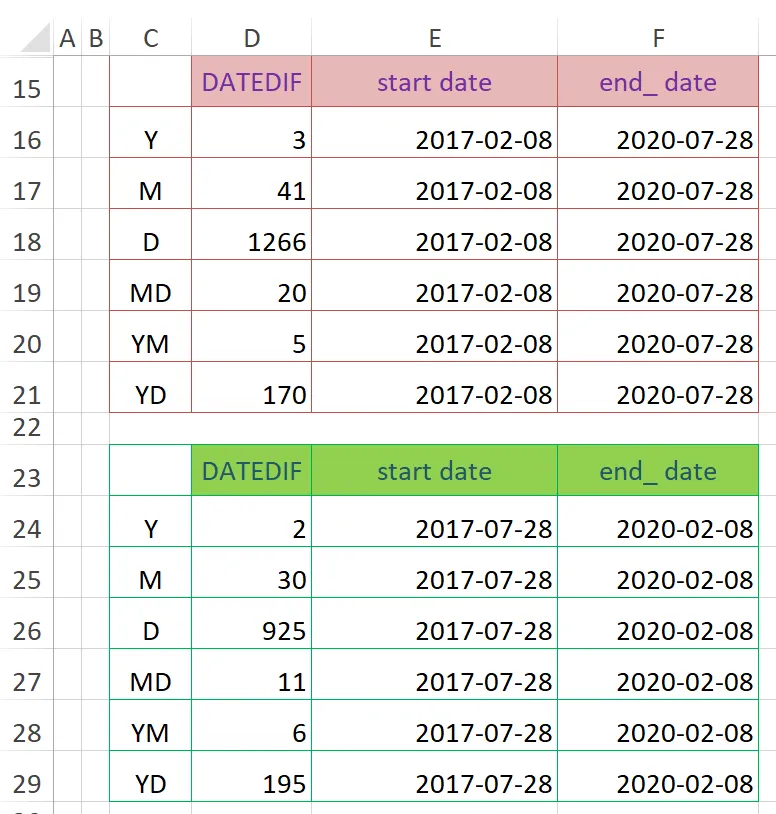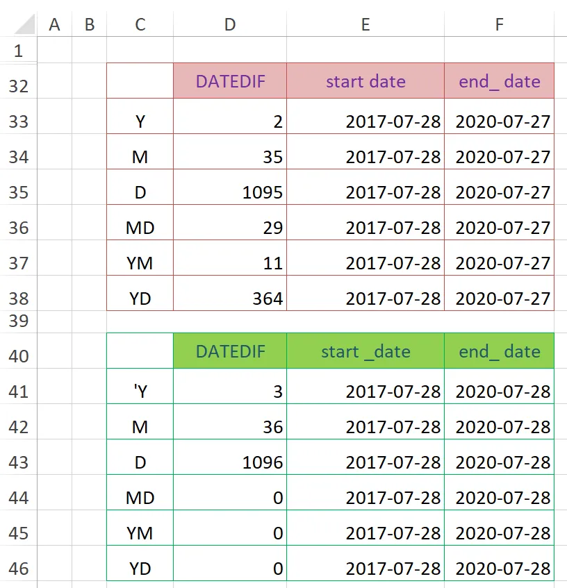 首先,在D16、D24单元格中分别输入以下公式,向下分别复制到D21、D29单元格,以计算出不同参数的差异:D24单元格,参数“Y”,单看2017年和2020年,相差年数应为3,但是从2017/7/28到2020/2/8,先过2年到2019/7/28,还没到要求的2020/2/8,再过1年的话,就到了2020/7/28,会超过结束日期,所以其结果返回2,不能返回3。D25单元格,参数“M”,2017/7/28过30个月便到了2020/1/28,然后再过1个月就到了2020/2/28,超过了结束日期2020/2/8,所以结果只能为30,不能为31。要充分体会“整年数”“整月数”中“整”字的意思。D26单元格,参数“D”,就相当于两个日期直接相减,计算天数的差。D27单元格,参数“MD”,这个计算忽略月和年,相当于把start_date拉近到end_date 前最接近的日期。也就是说,将2017/7/28拉近到2020/2/8之前日期为28的最接近日期,即2020/1/28,然后计算2020/1/28与2020/2/8之间的天数差,即11天。D28单元格,参数“YM”,忽略日和年计算整月数,即相当于把2017/7/28拉近到 2020/2/8之前最接近的7月28日,变成2019/7/28,然后计算其与2020/2/8之间的“整”月数差,即6个月。D29单元格,参数“YD”,忽略年计算天数差,相当于把start_date拉近到end_date前最接近的相同月和相同日的日期。也就是说,将2017/7/28拉近到2019/7/28,然后计算2019/7/28与2020/2/8之间的天数差,即195天。 在使用“MD”“YD”参数计算天数差时,由于闰年的存在,有时会与理想值相差一天,这种情况一般不会影响我们的日常使用。如下图所示,列出了2017/7/28到2020/7/27与2017/7/28到2020/7/28的对比,虽然end_date只差了1天,但是结果有比较大的差异。计算原理相同,要体会“整”字的含义。