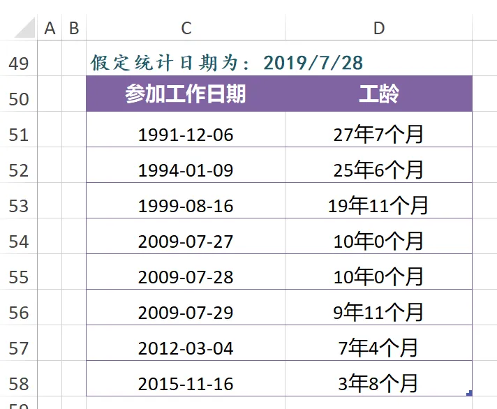 这么多参数需要怎么记忆呢?首先要知道这个函数的作用,理解每一个参数的计算原理。如果工作中常常需要计算日期,可以将其打印出来,贴在桌子旁即查即用。假定今天是2019/7/28,每个员工参加工作的日期如下图中C列所示,那么每个人的工龄是多少呢?工龄可表示成m年n个月的形式。