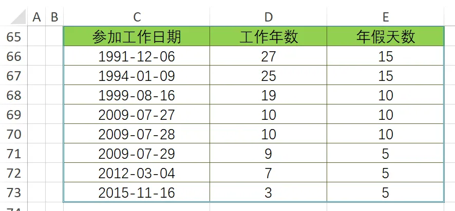 在这里再次强调,如果在公式中使用快捷输入的方式表达日期,必须加双引号,如上节中的“DATEDIF(C51,"2019/7/28","Y")”,如果掌握不了双引号使用,就规规矩矩地使用DATE函数,保证不会出错。根据D列的年数,可以计算法定年假的天数,在E66单元格中输入以下公式: =LOOKUP(D66,{0,1,10,20},{0,5,10,15}) 好了,今天的内容就是这些,如果你有兴趣,也可以自己尝试做一做练习。