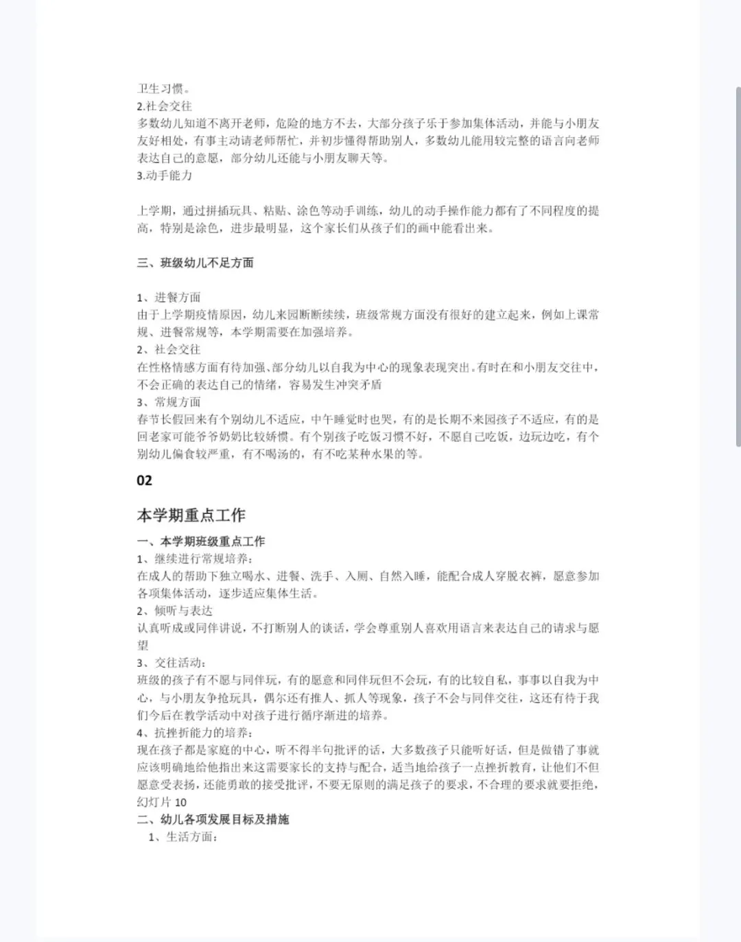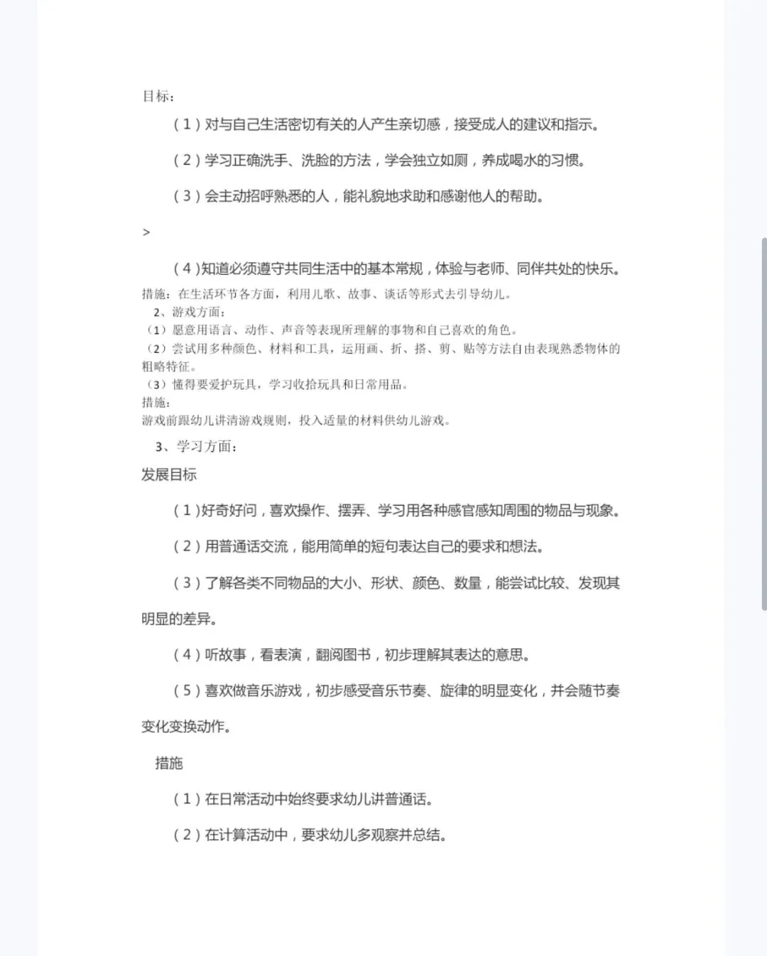 首先感谢各位家长在百忙中抽空来参加我班的家长开放日活动,也感谢你们一直以来对我们工作的理解和支持。这次召开家长会的主要目的是向各位家长汇报您的孩子从开学至今在园的生活、学习情况,同时通过本次家长会进一步增强家园联系,使我们不断改进工作和完善园内的管理。在上学期里,有你们的支持和配合,经过我们的共同努力,我们班取得很多成绩,这些成绩和你们在座的各位家长的支持是分不开的,所以,在这里我们希望各位家长朋友继续支持我们的工作。下面就将本学期的教育和保育及有关家长关心的问题向你们作如下汇报。在成人的帮助下独立喝水、进餐、洗手、入厕、自然入睡,能配合成人穿脱衣裤,愿意参加各项集体活动,逐步适应集体生活。认真听成或同伴讲说,不打断别人的谈话,学会尊重别人喜欢用语言来表达自己的请求与愿望班级的孩子有不愿与同伴玩,有的愿意和同伴玩但不会玩,有的比较自私,事事以自我为中心,与小朋友争抢玩具,偶尔还有推人、抓人等现象,孩子不会与同伴交往,这还有待于我们今后在教学活动中对孩子进行循序渐进的培养。现在孩子都是家庭的中心,听不得半句批评的话,大多数孩子只能听好话,但是做错了事就应该明确地给他指出来这需要家长的支持与配合,适当地给孩子一点挫折教育,让他们不但愿意受表扬,还能勇敢的接受批评,不要无原则的满足孩子的要求,不合理的要求就要拒绝, (1)对与自己生活密切有关的人产生亲切感,接受成人的建议和指示。 (2)学习正确洗手、洗脸的方法,学会独立如厕,养成喝水的习惯。 (3)会主动招呼熟悉的人,能礼貌地求助和感谢他人的帮助。 (4)知道必须遵守共同生活中的基本常规,体验与老师、同伴共处的快乐。措施:在生活环节各方面,利用儿歌、故事、谈话等形式去引导幼儿。(1)愿意用语言、动作、声音等表现所理解的事物和自己喜欢的角色。 (2)尝试用多种颜色、材料和工具,运用画、折、搭、剪、贴等方法自由表现熟悉物体的粗略特征。 游戏前跟幼儿讲清游戏规则,投入适量的材料供幼儿游戏。 (1)好奇好问,喜欢操作、摆弄、学习用各种感官感知周围的物品与现象。 (2)用普通话交流,能用简单的短句表达自己的要求和想法。 (3)了解各类不同物品的大小、形状、颜色、数量,能尝试比较、发现其明显的差异。 (4)听故事,看表演,翻阅图书,初步理解其表达的意思。 (5)喜欢做音乐游戏,初步感受音乐节奏、旋律的明显变化,并会随节奏变化变换动作。