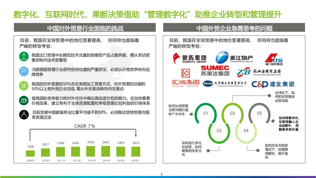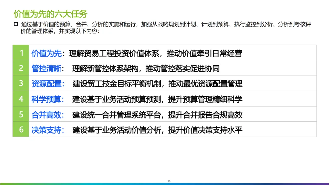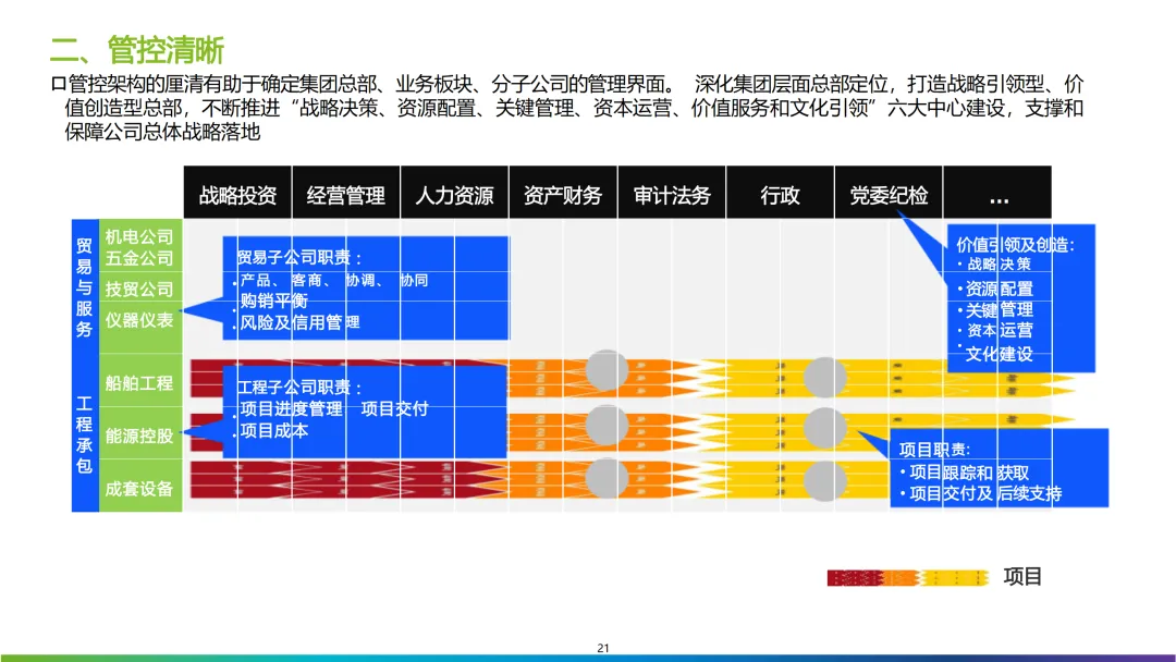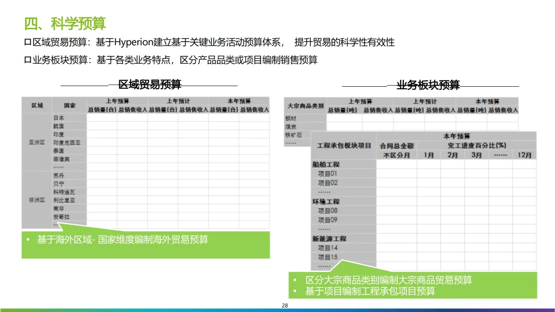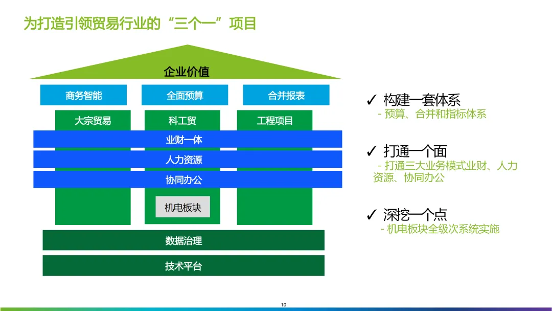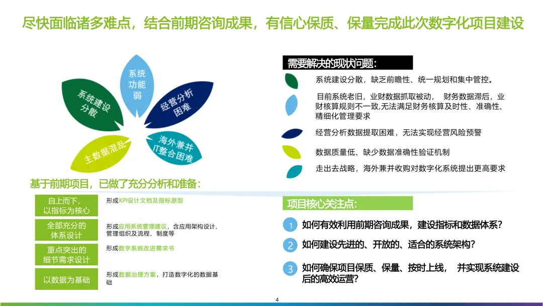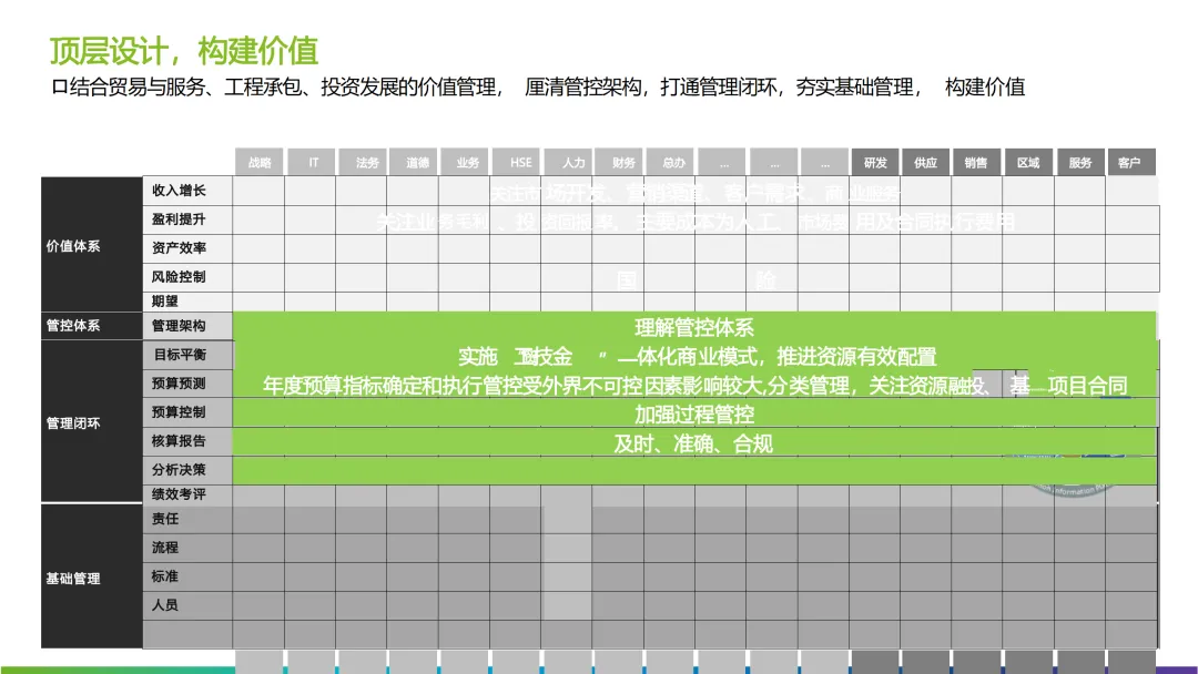 本方案面向多元化经营的大型集团企业,提出了一套以“价值创造”为核心、以“平台+组件”为架构的综合管理数字化系统实施蓝图。方案立足集团在战略管控、业财协同、数据治理、海外拓展等方面面临的现实挑战,充分承接前期指标体系和数据治理咨询成果,明确了“自上而下、以指标为核心、以数据为基础”的建设主线,旨在通过管理数字化助推集团转型升级。在总体架构层面,方案确立了以企业绩效管理、业财一体化、人力资源建设和协同办公为四大攻坚领域,聚焦大宗贸易、科工贸协同、工程承包三类典型业务场景,选取“卓越型”核心ERP平台与外围专业系统组合的模块化集成路径,确保架构先进性、开放性与适配性的统一。在实施方法论上,方案引入矩阵式项目治理机制与PIO统一项目群管理,以专业化分工与跨模块协同贯通建设全过程,同步推进制度优化、流程再造与人才培养,为系统可持续运营奠定组织基础。在具体功能设计层面,方案对企业绩效管理提出价值为先的六大任务,构建覆盖预算编制、合并报告、经营分析的全链路闭环;在业财一体化领域,统一财务标准体系,实现票、货、款三流协同,搭建客商信用闭环、资金预测模型与合同盈利分析平台,强化贸易业务全生命周期的风险管控与效益评估;人力资源模块致力于打造覆盖员工职业生涯全流程的数字化管理平台,实现组织、人事、薪酬、社保的一体化协同;协同办公与网上商城的引入,则依托阿里1688生态,推动采购模式从需求驱动向电商化协议采购转型,显著提升用户体验与采购绩效。方案同时强调数据治理的基础性作用,通过建设统一数据仓库、主数据管理平台与自助式BI分析工具,将前期指标体系成果固化落地,形成从数据采集、清洗、建模到可视化决策的完整数据价值链。整体而言,本方案以系统性、可落地、可扩展为原则,不仅为集团数字化转型提供了清晰的实施路径与管控机制,更构建了面向未来的数字化运营能力底座。