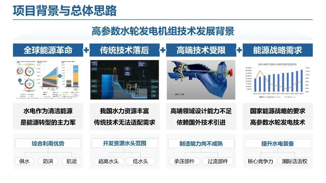 本项目为省科奖(科学技术进步奖) 答辩核心内容,聚焦高参数水轮发电机组技术,针对全球能源革命下传统水电技术落后、高端设计能力不足等瓶颈,通过多场耦合优化、智能监测调控与精密制造三大核心创新,突破国外技术垄断,为我国水电装备核心竞争力提升与能源战略落地提供关键支撑。