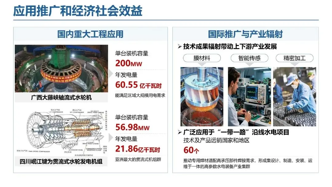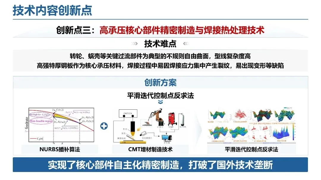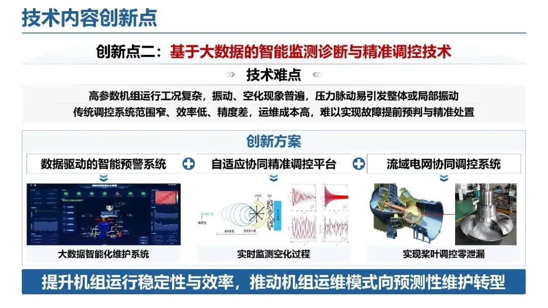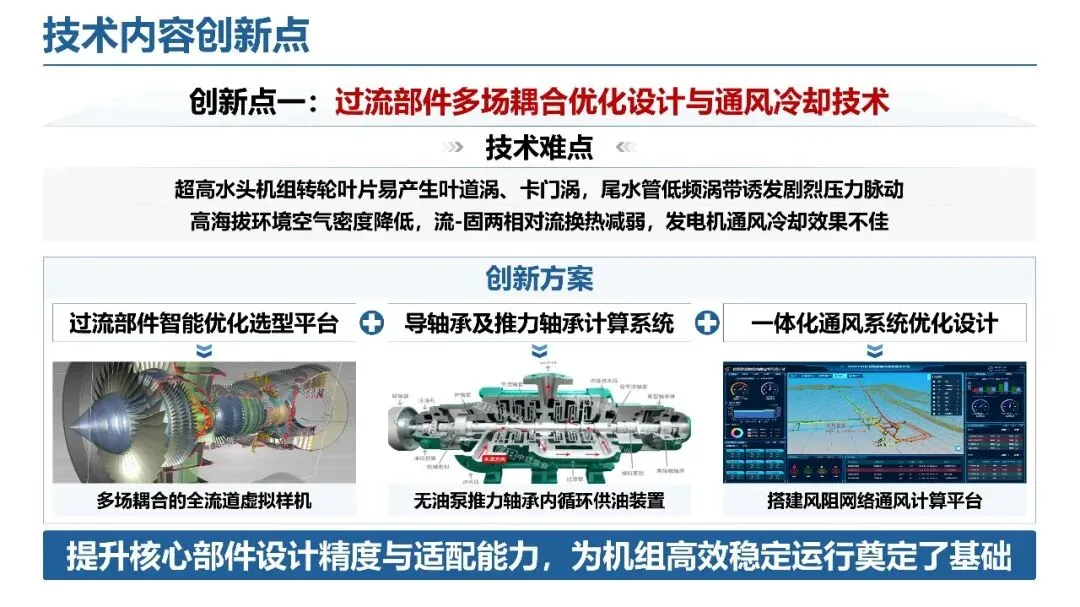 过流部件多场耦合优化:针对超高水头叶道涡、高海拔通风冷却差等难题,构建智能优化选型平台与轴承承力计算系统,实现一体化通风系统优化,提升核心部件设计精度与适配能力,为机组高效稳定运行奠定基础。大数据智能监测调控:突破传统调控范围窄、精度差的瓶颈,构建数据驱动预警系统、自适应精准调控平台与流域电网协同系统,实现空化过程实时监测与桨叶零泄漏调控,推动运维模式向预测性维护转型。核心部件精密制造:攻克转轮、蜗壳等复杂曲面制造与高强厚钢板焊接难题,通过 NURBS 插补算法与 CMT 增材制造技术,实现核心部件自主化精密制造,打破国外技术垄断。四、评价