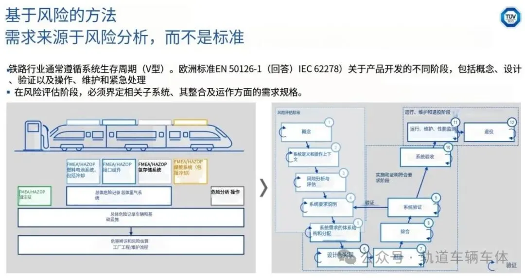 基于铁路行业通常遵循系统生存周期(V型)。即欧洲标准EN50126-1 (resp. IEC 62278)关于产品开发的不同阶段,包括概念、设计验证以及操作、维护和紧急处理。在风险评估阶段,必须界定相关子系统、其整合及运作方面的需求规格。