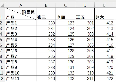 如下图所示,数据从第2行开始(第1行为表头),A列为产品信息,B~E列是4个销售员对应的销量,且数据不重复