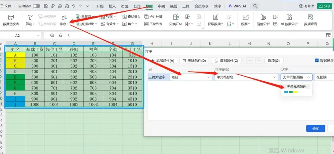 首先,选中区域,比如蓝色方框区域,点击"数据",再点击"排序",再点击"自定义排序",在出现的弹框里,选择要排序的颜色。