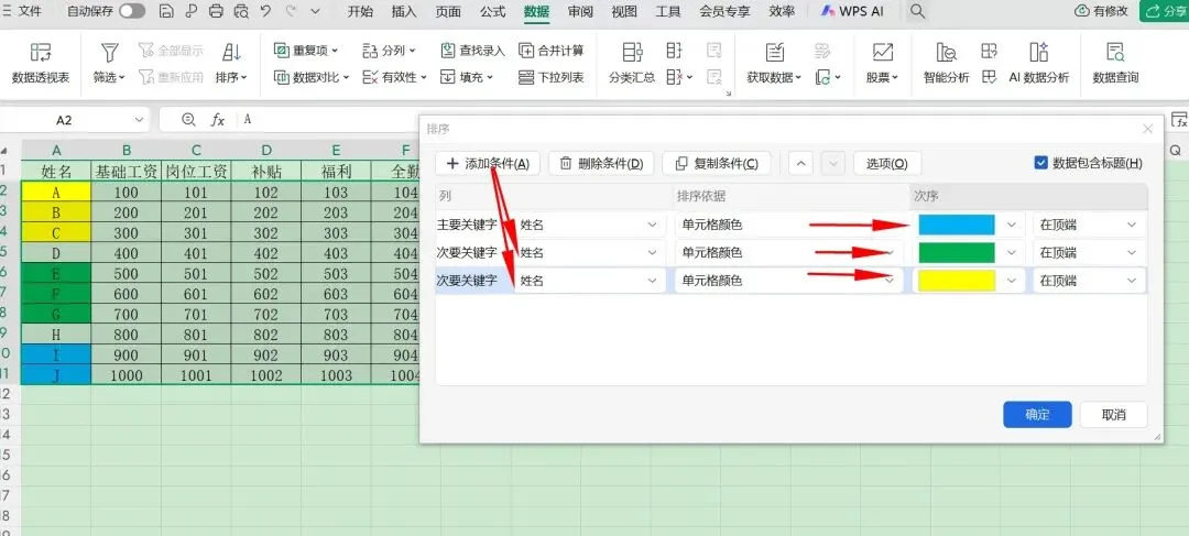 比如这个表里有三个颜色,那么在关键字那里选择颜色的名称栏即"姓名",在"排序依据"里选择"单元格颜色",在"次序"里选择自己想要排序的颜色,比如,我想按蓝色,绿色,黄色,依次排序,则要在选择了蓝色之后,再点击上方的"添加条件",依次选,直到把三个颜色选完。