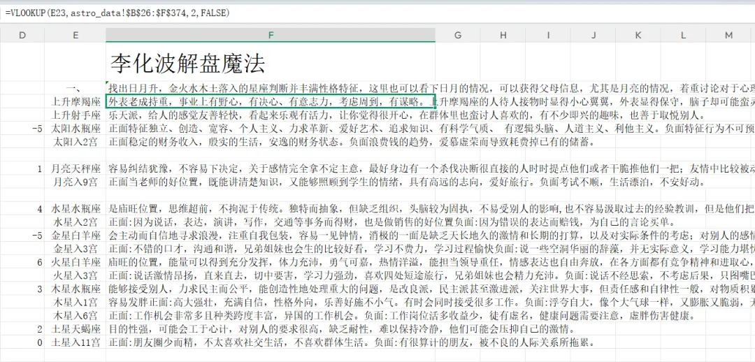 一开始真的很朴素:我用 Excel 搭了一堆表格,把课程里那种“词条型解读”做成检索——比如太阳落在水瓶,就用公式把对应解释调出来(当时用的就是 VLOOKUP 那套)。