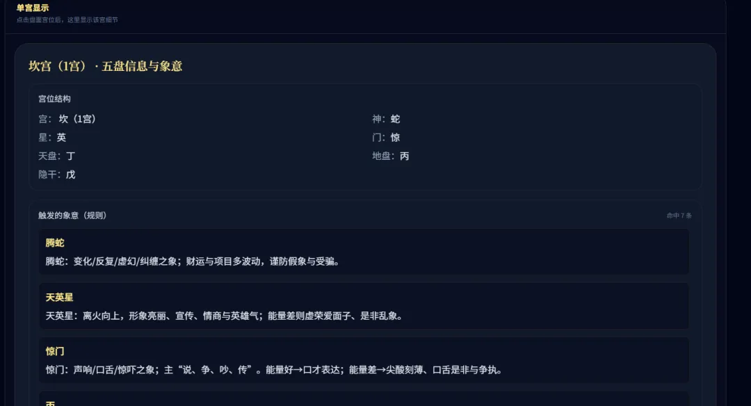 所以我现在做的方向是:把内容做成知识库,把判断逻辑做成规则引擎,再用前后端做成一个更好用的网页系统——你打开就能用,不用再在一堆文件、表格里翻来翻去,并且是会不断更新的,随着后台的解读引擎优化,相应的解读也会升级。同时还要有阶段性的注意事项,比如最近有凶的地方,就避免在那人时段,去那个地方。