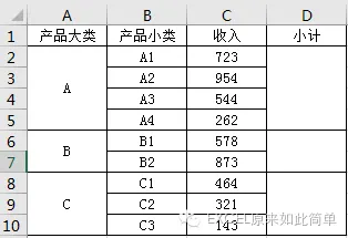 如果类别不是合并单元格,我们直接使用sumif函数就可以在D列计算该类别的和(想想怎么写公式,提示借助通配符*),但合并后求和就不那么容易了。