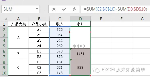 公式原理:倒算原理:SUM(C2:$C$10)即所有数据的和,SUM(D3:$D$10)是本类别以后所有类别之和,如果二者相减,正好是本类别的和。