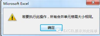如果我们按照传统的往下拖动填充方法添加序号,系统会弹出这样的提示“若要执行此操作,所有合并单元格需大小相同”,如图4。