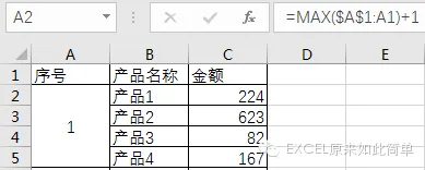 公式说明:计算自$A$1单元格至公式所在行的上一行的最大值,再用计算结果加1,从而实现连续序号的效果。