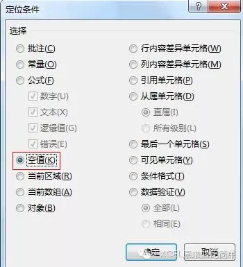 ,定位条件选择空值,如图9,这样就把空白的部分全部选中了,