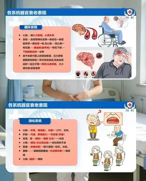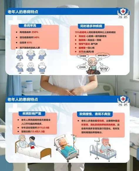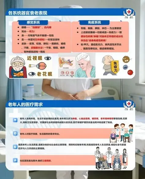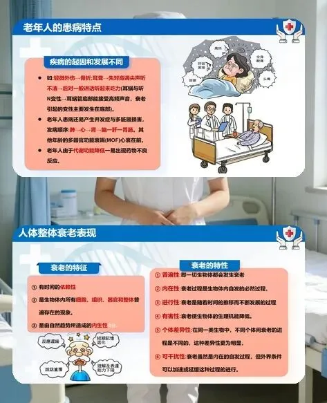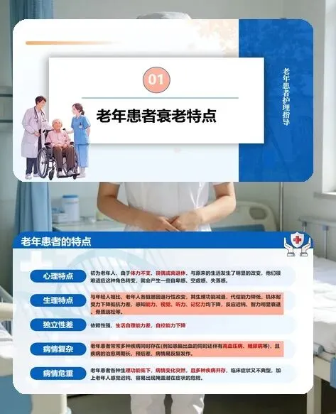 各位同事,今天咱们聚焦临床护理的重点群体 —— 老年患者的护理工作。老年人各脏器功能退行性改变,患病率高、病情复杂且多并存多种疾病,还常伴有自卑、孤独等心理问题,护理核心就是 “精细照护、人文关怀、安全防护”,用专业和耐心守护好老年患者的晚年健康。