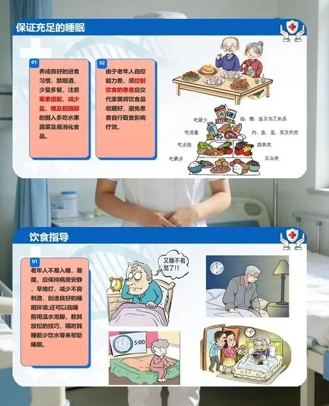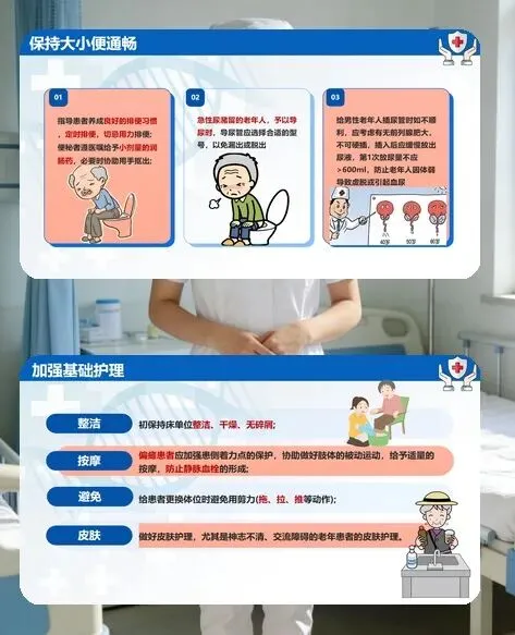 老年患者的护理要针对性施策。基础护理上,要保持床单位整洁干燥,做好皮肤护理,更换体位时避免拖、拉、推等动作,偏瘫患者需加强肢体被动运动和按摩,预防压疮和静脉血栓;饮食上遵循 “少盐、少糖、低脂、易消化” 原则,少量多餐、荤素搭配,保证营养均衡;睡眠方面,营造安静的睡眠环境,指导患者睡前温水泡脚、少饮水,帮助改善睡眠质量;还要关注大小便通畅,避免用力排便诱发不适,导尿时严格把控操作规范。