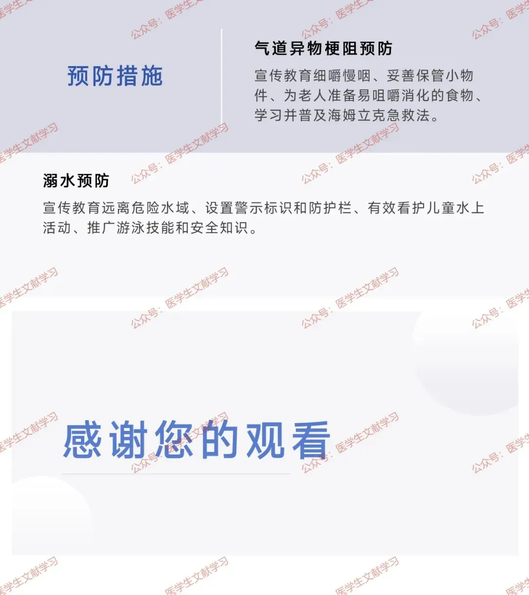 气道异物梗阻预防:宣传细嚼慢咽,妥善保管小物件,为老人准备易咀嚼食物,普及海姆立克法。
