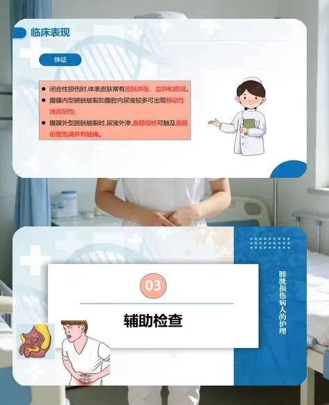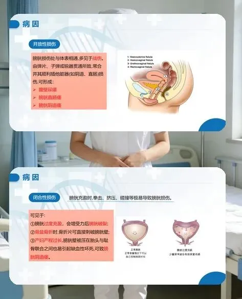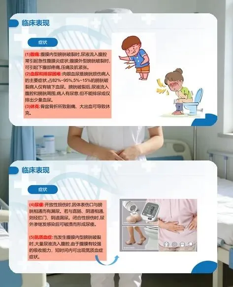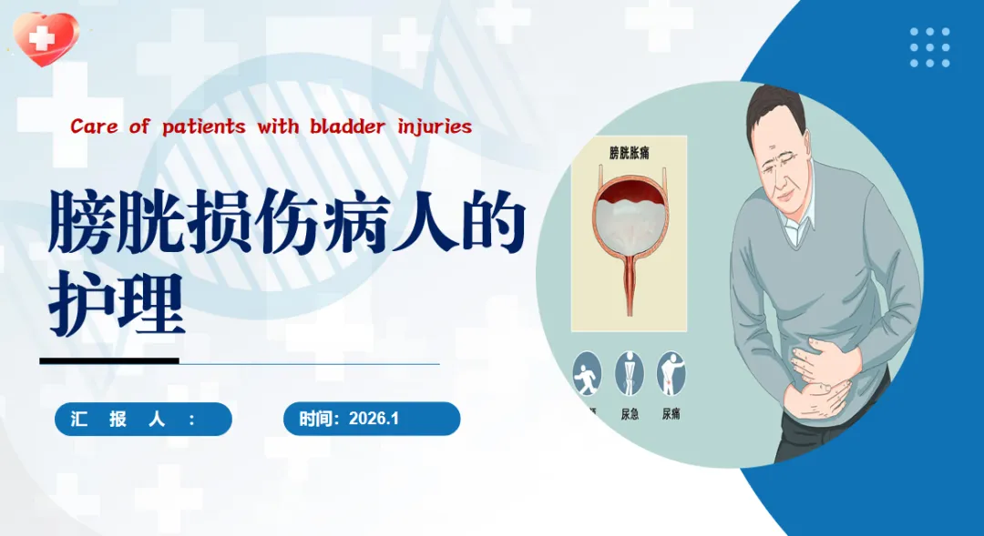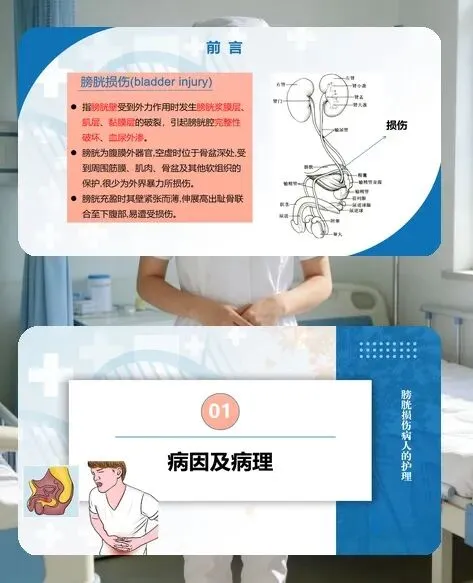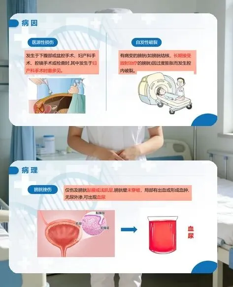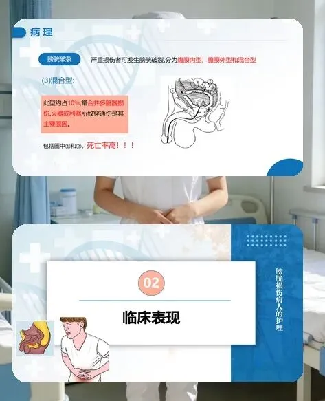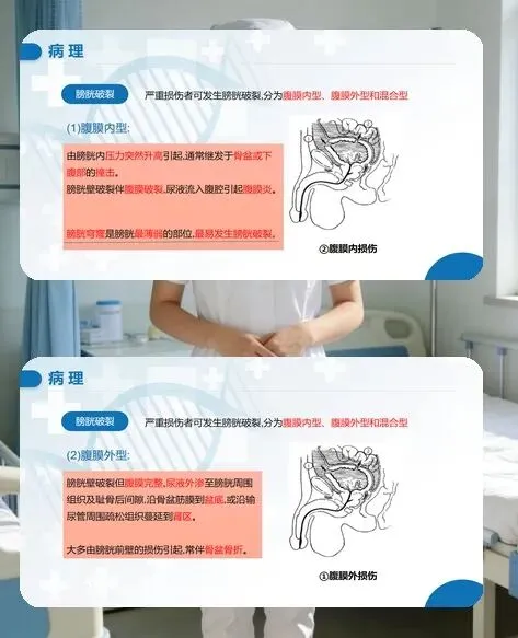 各位同事,今天咱们聚焦泌尿外科常见急症 —— 膀胱损伤的护理工作。膀胱损伤多由外力撞击、骨盆骨折或医源性操作引发,充盈状态下的膀胱因壁薄更易受损,按病理可分为挫伤和破裂(腹膜内型、腹膜外型、混合型),护理核心就是 “快速急救、精准护管、防控感染、促进修复”,这是咱们泌尿外科护理人必须熟练掌握的实操技能。