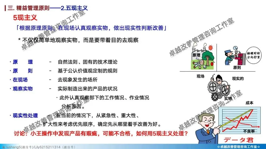 · 问题解决:发生问题不找借口,到现场用“5个为什么”分析法找到根本原因。