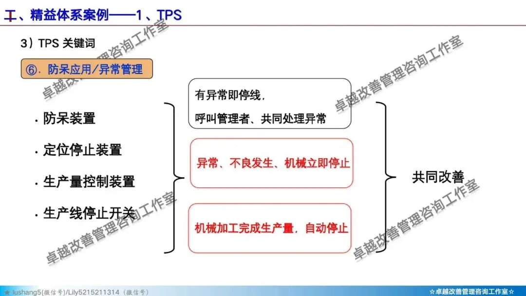 · 自働化:给设备增加异常停机功能,或给人工岗位设计防错装置。