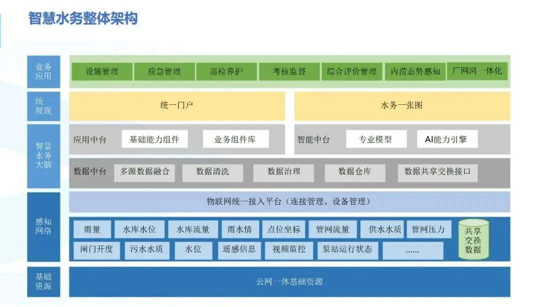 智慧水务的本质,是利用新一代信息技术,深度赋能水务系统的全流程、全要素,实现数据驱动下的智能化决策、精细化运营和一体化服务。其核心架构通常包括以下几个层面: