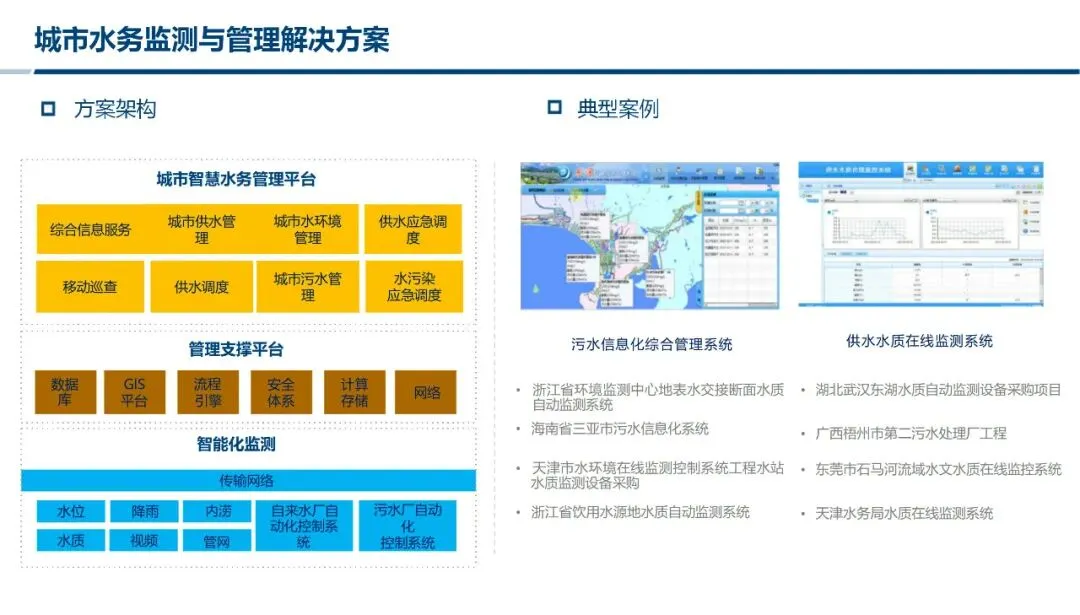 应用层(“智慧场景”与“价值体现”): 基于平台层的能力,开发出面向不同业务需求的智能化应用系统,这才是智慧水务价值最终落地的地方。典型应用包括: