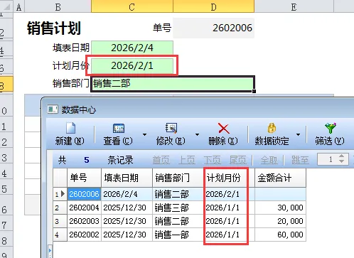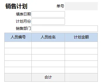 设置六个字段:单号,填表日期,计划月份,销售部门,部门编号,金额合计。