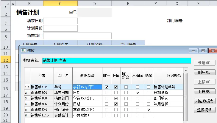 "单号"使用了自动编号数据规范“销售计划单号”,而且设置了“唯一”和“必填”。