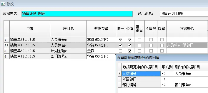 设置四个字段,人员编号,人员姓名,计划金额,部门编号